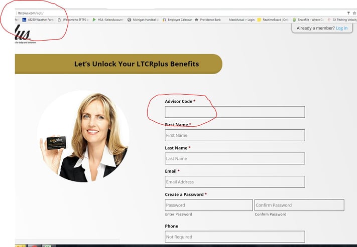 You were previously provided a link and instuctons on how to use your personal link. Bascially the link is www.ltcrplus.com/AGB and some specific code tied to you. When a person clicks the link, a web page opens up and the Advisor code field - the lower circle in red in the picture below is prepopulated with your code. The prospect enters their personal information and clicks "Activate LTCRplus."